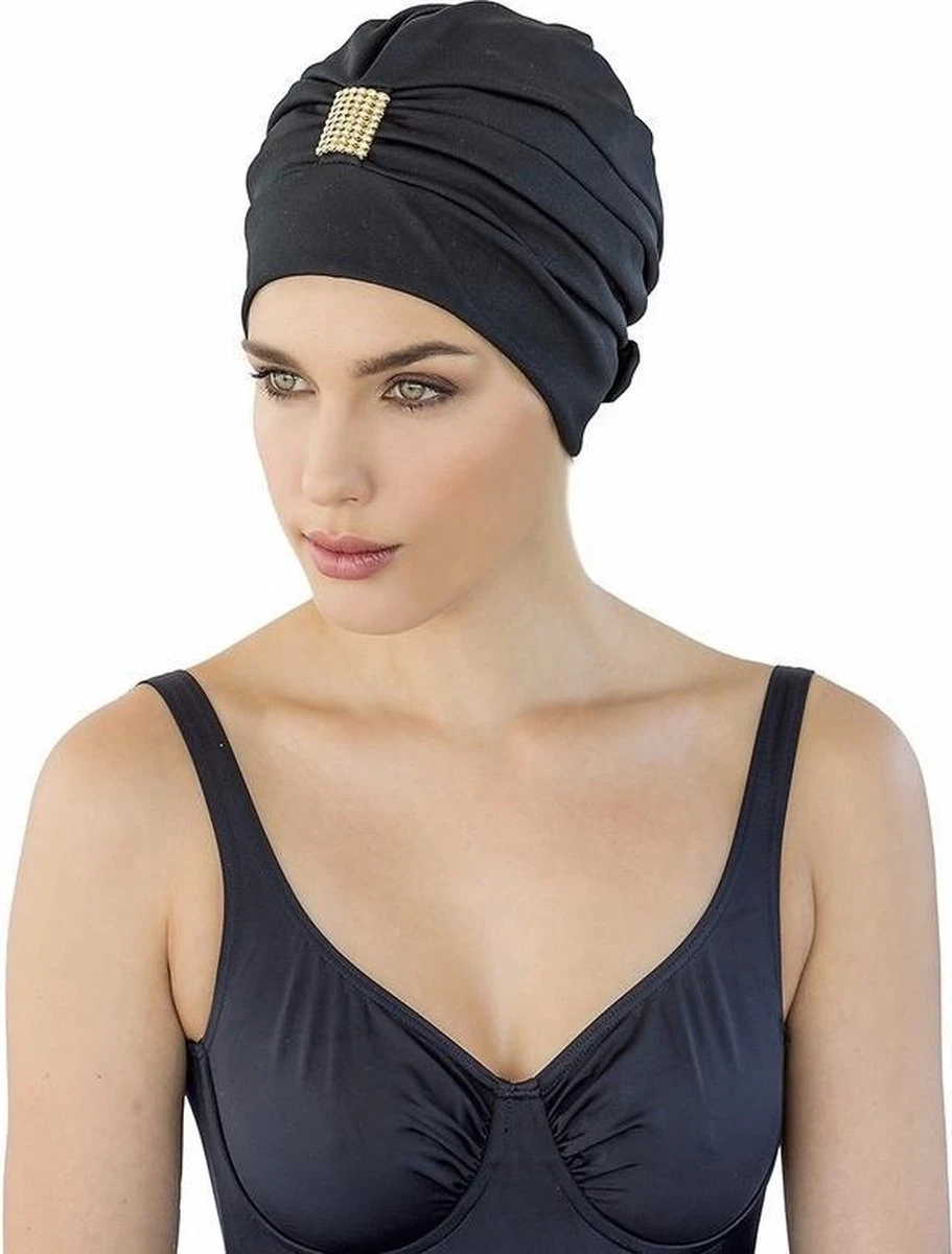 Zwarte badmuts tulband voor dames. De badmuts is in grootte verstelbaar d.m.v. een klittenbandsluiting. Materiaal: 100% polyester. Hoofdomtrek ca. 56 cm.