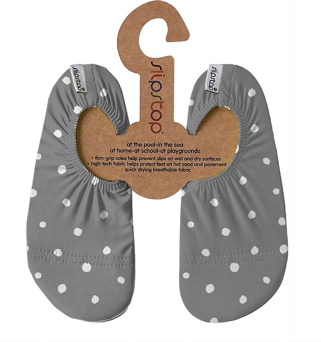 Slipstop Nebula – Grijs met witte stippen voor jongens en meisjes Grijze Slipstop schoentjes met witte schattige stippen! Deze hippe kleur slipstopsshoes kunnen goed onder de zwem outfitjes van dit seizoen voor zowel jongens als meisjes.