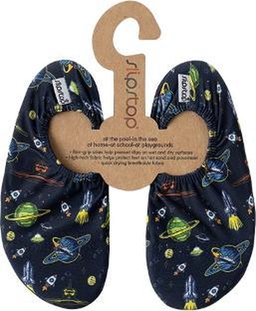 Slipstop Saturn – Donker blauwe waterschoenen met planeten Stoere donker blauwe waterschoenen voor jongens staan helemaal leuk onder elk outfit. De planeten zijn subtiel aanwezig in het dessins, dus matchen daarom gemakkelijk met de zwembroek of ander outfit.